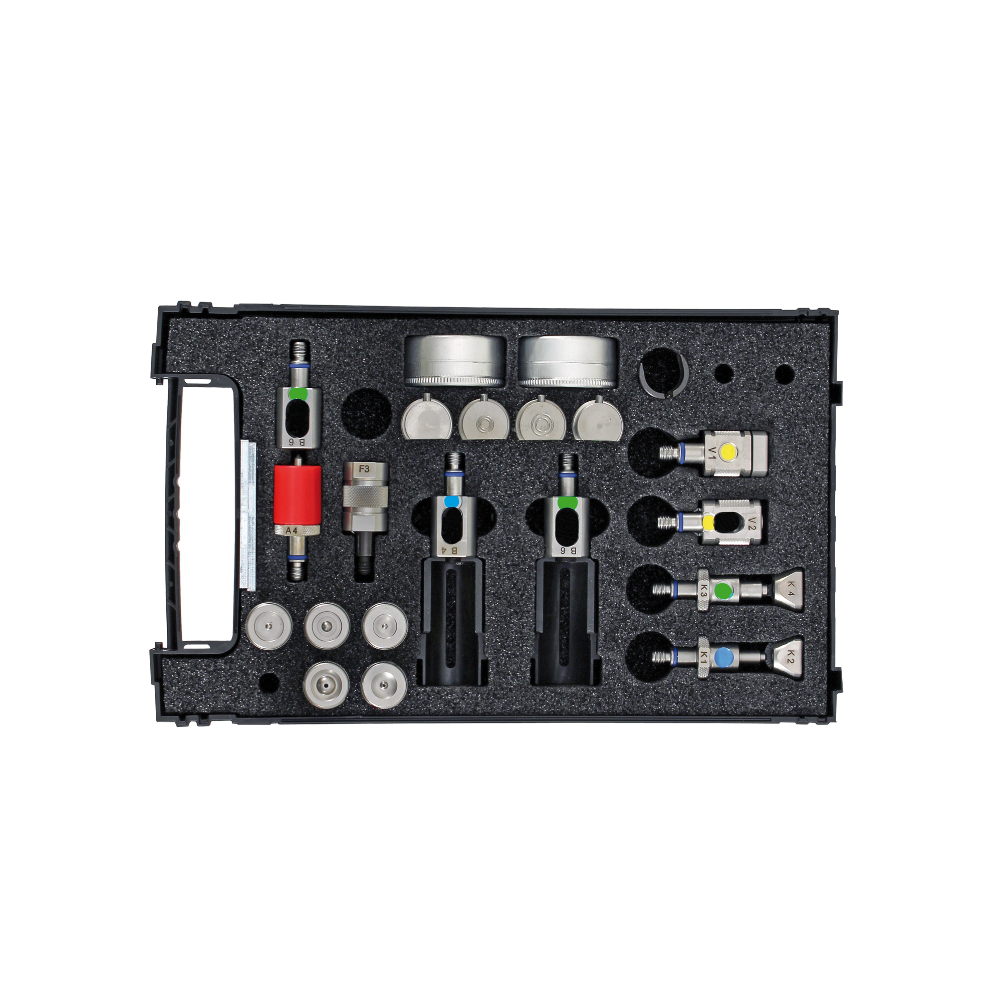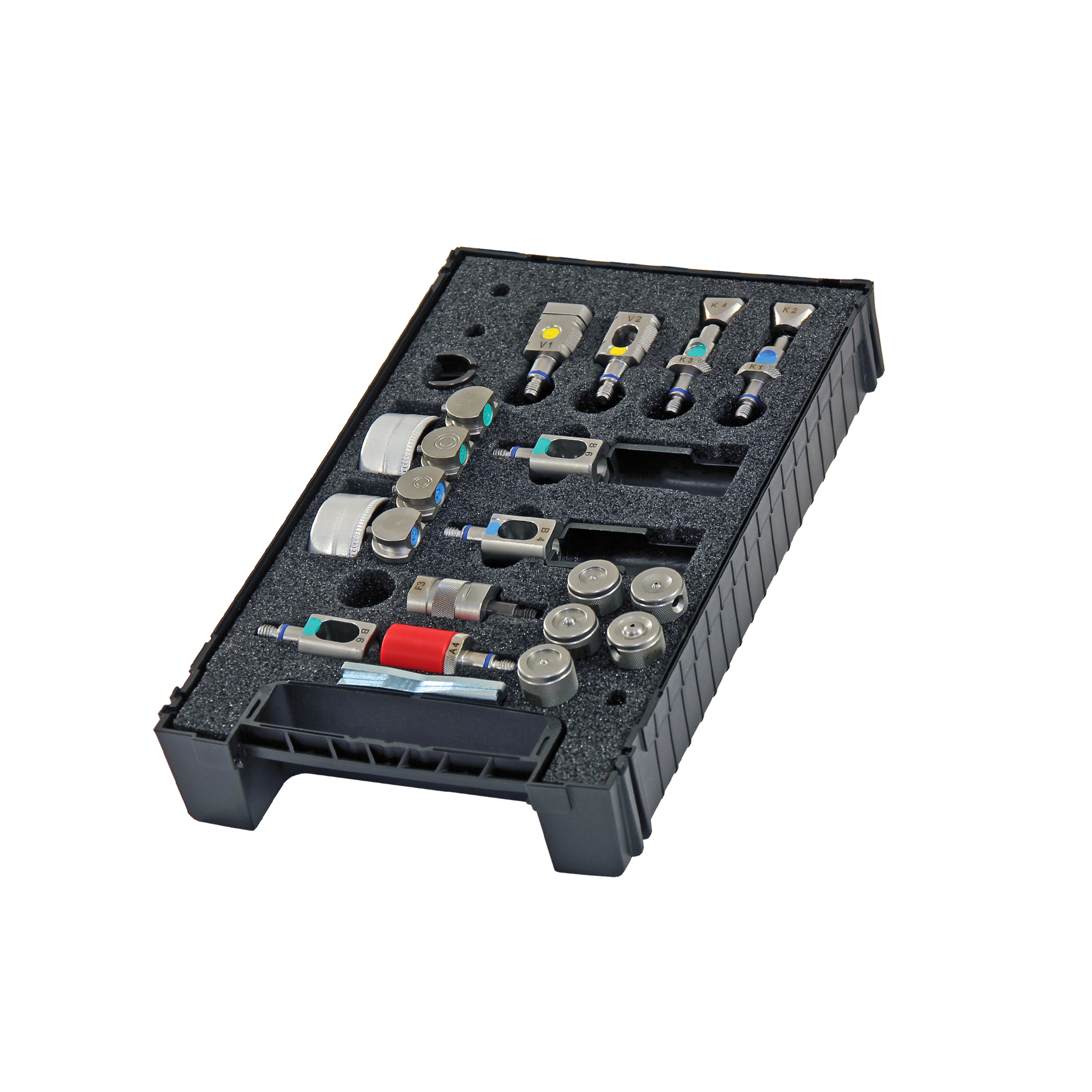 24-częściowy zestaw nitownic z narzędziami (WKZ) do nitowania nitów przetłoczeniowych (FFN) 6,0 i 8,0 mm, trzpień do wyciskania (PU) do nitowania samonakłuwającego, brodawka zamykająca do formowania wstecznego, wybijania i kalibrowania Ø 6 i 8 mm, przedłużka 26 mm, łącznik PushPull i klucz montażowy.